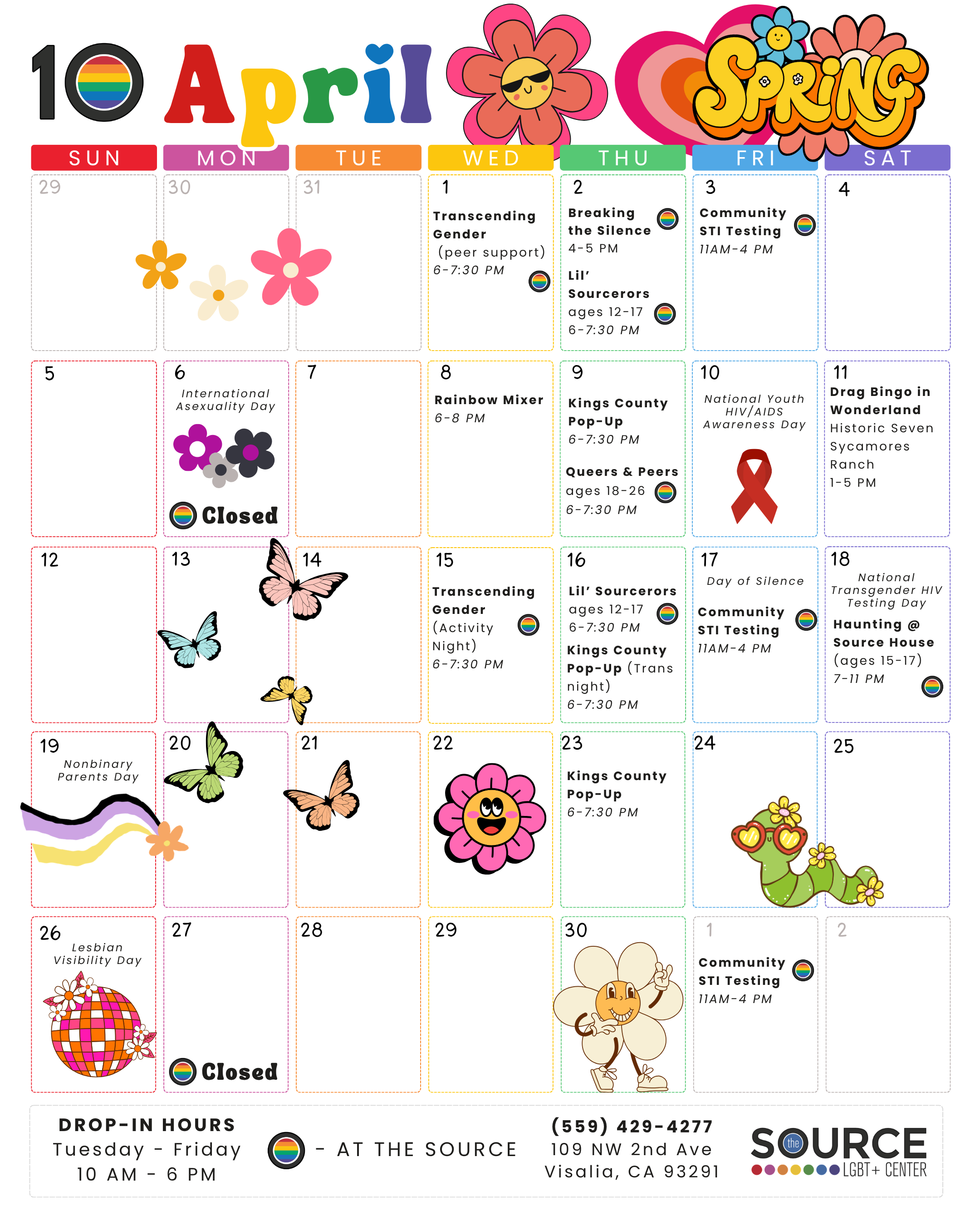 The Source LGBT+ Center is located in the historic Lincoln Oval in beautiful Downtown Visalia. Our Center has large meeting spaces, a youth room, trans closet, food pantry, lending library, HIV Services, support groups, and more.